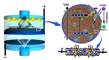 (3)为进一步提升滤膜体系的氧化能力,刘艳彪团队同时将光化学和电化学与膜分离技术进行耦合,构筑新型的光电活性滤膜技术。例如,以光响应型铁基MOF改性的CNT膜作为阳极,可在光电协同作用下利用光激发产生的h+和OH•等活性物种实现三价锑的脱毒,氧化产物五价锑可被铁基MOF材料进一步吸附去除,见图3。类似的概念同样适用于其他类似有毒重金属离子(如六价铬和三价砷)的超快脱毒(t<2秒)。相关研究成果发表在环境领域著名期刊Journal of Hazardous Materials (2019, in press),Chemical Engineering Journal (2019, minor revision),Science of The Total Environment (2019, 668, 966)和Chemosphere (2020, in press)上。