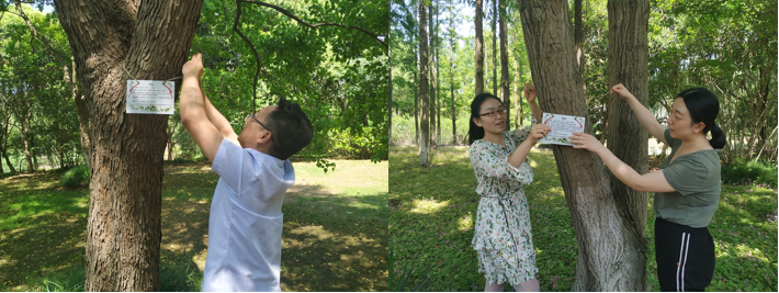 绿色是生命的象征、是文明的标志,广大师生是生态文明建设的重要力量。为了更好的创建绿色生态校园,环境科学系党支部联合环境学院本科生党支部,在深入认知植物的基础上,结合专业知识,为校园内的植物设计了“名片”——以植物标牌的形式给校园内的植物做标记,“名片”上注明植物的形态特征、品种特性、环境功能和校园分布,让植物的信息一目了然。为了达到不破坏植物又吸引师生的效果,挂牌的方式也经过精心设计,高大的乔木采取挂牌的设计样式,用细绳将“名片”悬挂在树干上;低矮的灌木采取插牌的设计样式,用金属杆将“名片”竖立在泥土中。在历时6个月的植物“名片”挂牌活动中,共计标识了41个品种的植物,设置了75块植物标牌。挂牌结束后,党支部师生党员们也自发成立了“标牌维护志愿队”,后续将对安置好的植物标牌进行定期检查,清理异物杂物,若发现破损及时修理或更换,以保证“践行生态文明,共建绿色校园”系列活动具有可持续性和长期的影响力。
