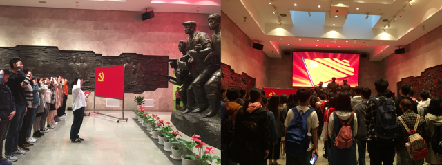 随后所有人来到中共四大纪念馆,参观学习中共四大的历史背景和历史意义。中共四大是中国共产党历史上一次具有重大意义的代表大会,大会第一次提出了无产阶级在民主革命运动中的领导权问题,确立了加强党的领导、扩大党的组织、执行使党群众化的组织路线。在中共四大纪念馆中,环境学院员工党支部的39名正式党员与预备党员庄严宣誓,重温入党誓词,表达了对党的忠诚和为共产主义奋斗终身的坚定决心。环境学院入党积极分子观看了本次入党宣誓仪式,党员掷地有声的誓言激励着每一位同学努力学习、积极进取,更加坚定了他们加入党组织的信念。