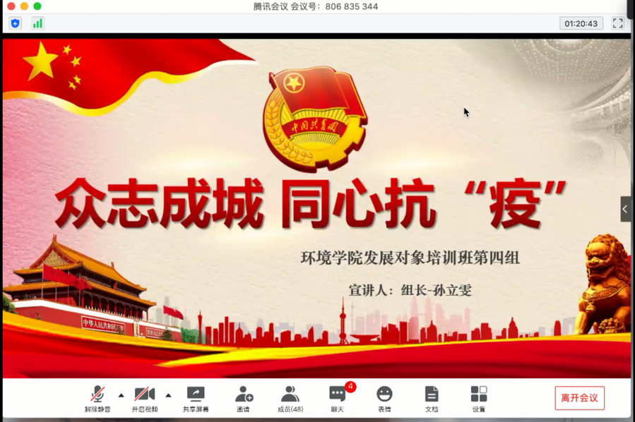 为深化发展对象对党的认识和理解,提高同学们的思想觉悟和党性修养,环境公司党委党校于2020年4月28日在腾讯会议平台开展环境学院“砥砺青春践初心,奋进东华诉真情”主题活动暨2020发展对象培训班结业检阅。环境学院员工党建负责人赵晖老师、环境学院本科生党支部书记胡昊、暖通学硕党支部书记董玉芳、环境学硕党支部副书记周添一、环境学院专硕党支部书记章基法共同出席了本次结业检阅。