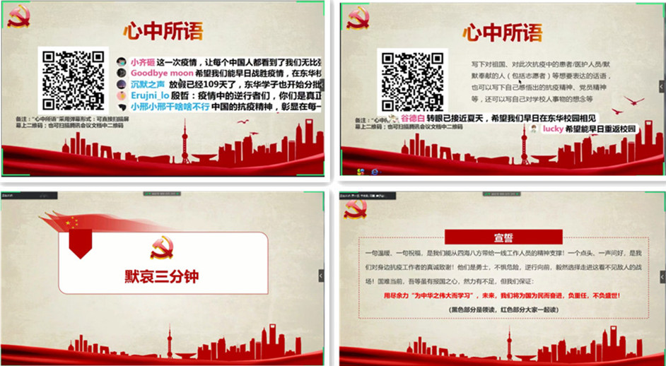 一条条的弹幕包含着发展对象的爱国之情,他们写下“心中所语”,写下对此次抗疫中白衣天使们的感谢,或发自肺腑,或深刻感人。默哀之时,既有悼念,更有警醒,短短三分钟,不仅是深切悼念那些牺牲的烈士和逝世的同胞,更是对自我的警醒。“用尽余力‘为中华之伟大而学习’,未来,我们将为国为民而奋进,负重任,不负盛世!”激昂的宣誓与默哀的肃穆形成强烈对比,展现了发展对象们入党的决心。