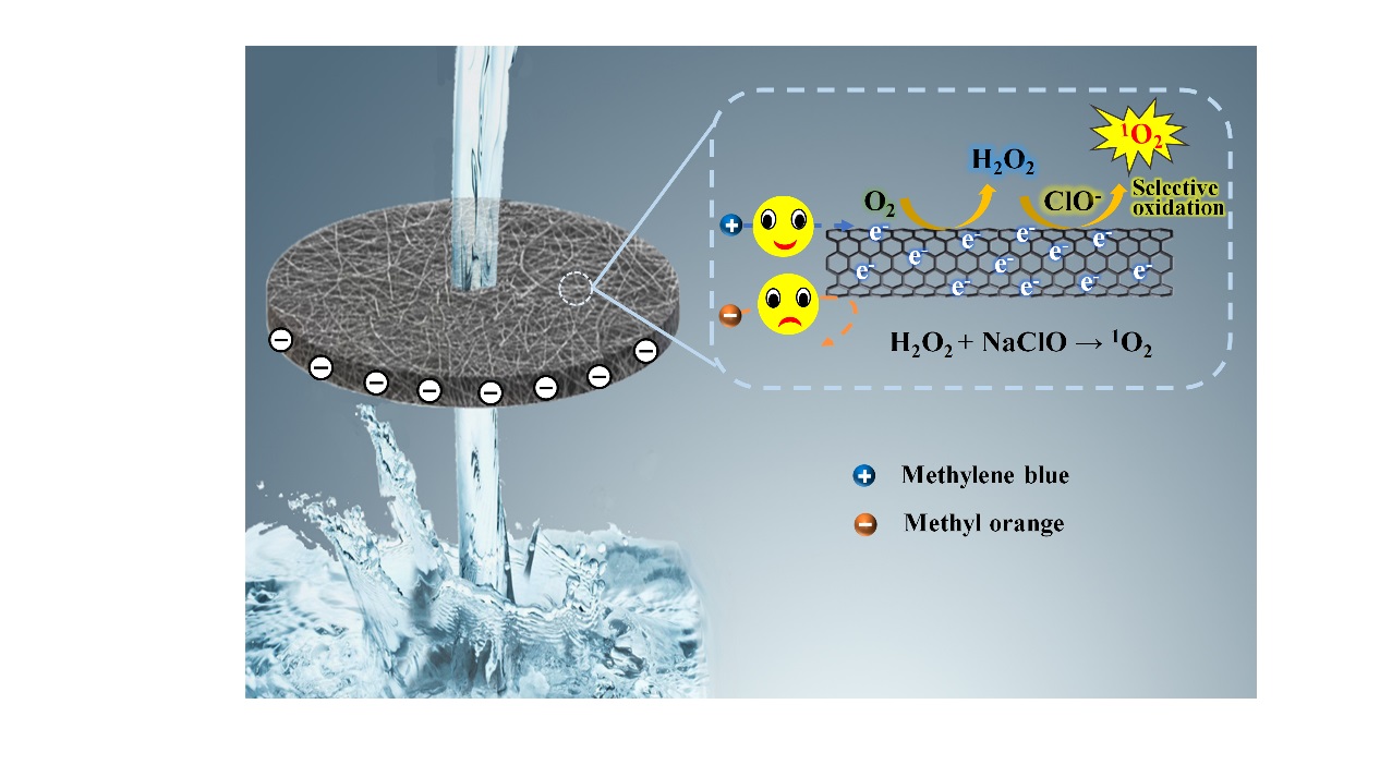 该研究开发了一种适用于有机污染物选择性降解的电化学过滤系统,如图1所示。该系统基于碳纳米管材料的催化特性,将O2选择性两电子还原为H2O2,再利用[ClO-]和H2O2间特异性反应原位生成单线态氧(1O2)。在获得最佳操作条件的基础上,本文探究了阳离子型染料和阴离子型染料的降解性能。结果表明,该系统可选择性高效降解阳离子型染料分子(如MB和R6G),仅单次流经该系统即可实现>95%的降解效果(<3秒)。电子顺磁共振谱和自由基捕获实验均证实,本系统中起氧化作用的主导活性物种为单线态氧。该研究成果为水环境治理和修复提供了更具选择性且更高效的可行方案。