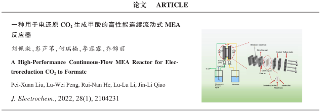 近日,公司乔锦丽教授课题组工作“一种用于电还原CO2生成甲酸的高性能连续流动式MEA反应器” (A High Performance Continuous Flow MEA Reactor for Electroreduction CO2 to Formate)被作为封面论文发表在《电化学》2022年第1期。