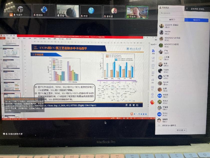交流活动共进行了一个半小时,邓教授围绕非均相过硫酸盐高级氧化体系中新型催化剂的结构设计和活化机制进行了精彩分享,并深入介绍了体系中高活性氧化物种与目标污染物去除效果之间的构效关系以及如何结合DFT计算等挖掘自由基的作用机制。整个分享过程深入浅出,对员工有重要的启发和指导意义。参会师生与邓老师就高级氧化技术的发展前景以及创新性研究如何开展等话题展开了进一步讨论。