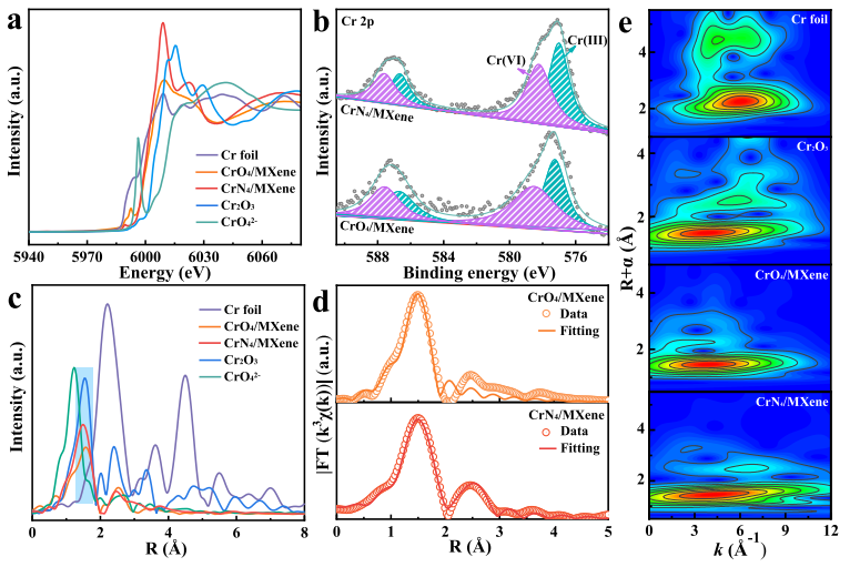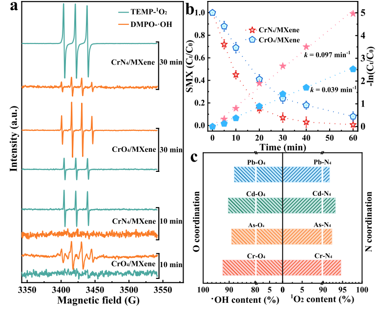 基于此,刘艳彪教授团队提出了一种N配位重金属单原子基流体电极的通用制备策略。在电催化体系中,N配位有效调控了CrN4/MXene电极表面Cr–O2•–中间体的解吸过程,从而促进选择性生成活性氧物种(1O2)。同时,1O2能高效降解水中的富电子有机污染物。这项工作为重金属和有机污染物的治理提供了基于吸附、电催化和膜分离技术的高效集成体系。