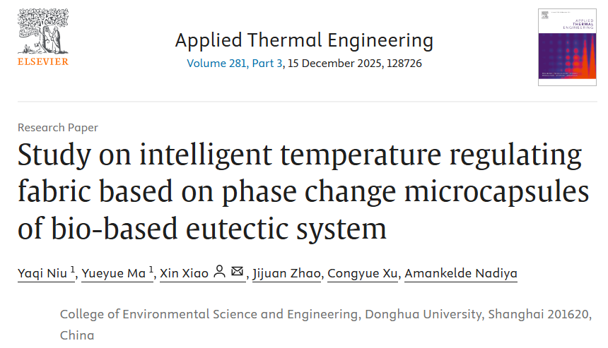 文章链接:Yaqi Niu†, Yueyue Ma†, Xin Xiao*, Jijuan Zhao, Congyue Xu, Amankelde Nadiya. Study on intelligent temperature regulating fabric based on phase change microcapsules of bio-based eutectic system. Applied Thermal Engineering, 2025, 281: 128726.