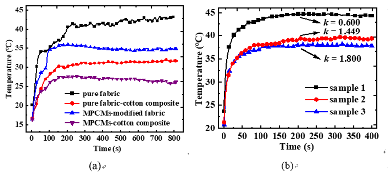 图3 (a) 加热过程中不同面料测样的热电偶测试温度变化曲线;