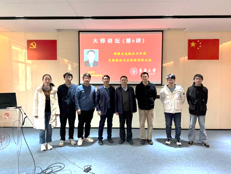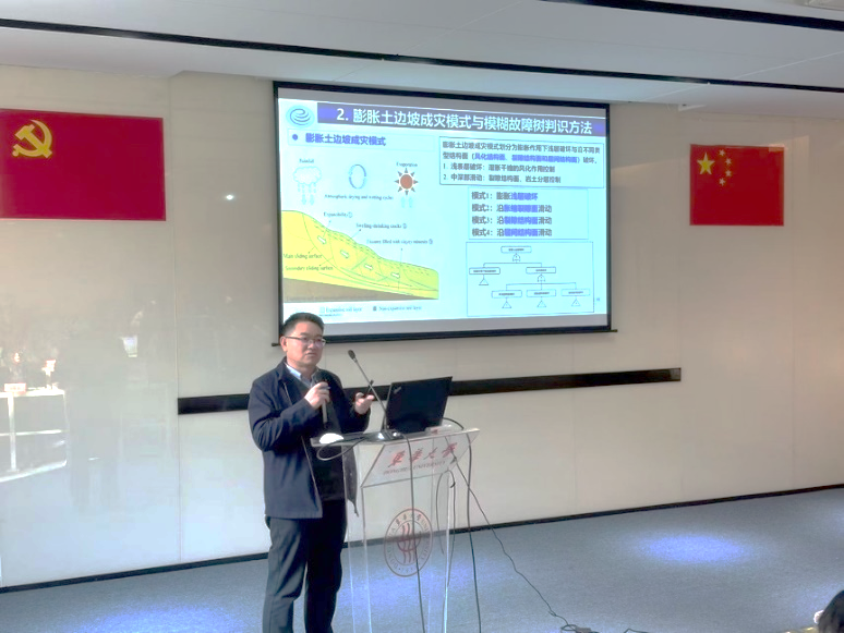 孔令伟针对膨胀土灾害频发与边坡失稳破坏机理不清现状,着重分享了团队在膨胀土灾害孕育环境与边坡成灾模式判识、膨胀土胀缩性-裂隙性耦合效应、膨胀土变形损伤特征、膨胀土原位工程特性等方面的研究成果,介绍了调控抑制膨胀土胀缩性能与干缩开裂的技术方法,分析了膨胀土边坡稳定性演化的改进矢量和方法,并与师生进行了广泛交流与探讨,勉励师生脚踏实地,开展原创性、引领性科技攻关。