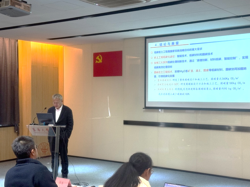 刘松玉以国家“双碳”战略为背景,详细分享了团队在固碳岩土工程和固废岩土工程领域的创新成果,介绍了固碳复合桩、固碳轻质土、固废基低碳轻质土、膨胀土基泡沫轻质土、预应力低碳工法桩、固废基固化剂处理污染土等技术方法及其工程应用。报告内容丰富、前瞻性强,极大地拓宽了师生的学术视野,引起了广泛的讨论,激发了师生创新精神和内在动力。